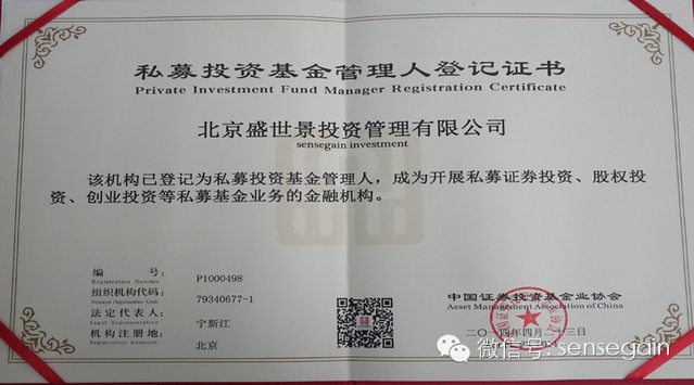 In April 2014, Sensegain received the Registration Certificate of Private Investment Fund Manager issued by China Securities Investment Fund Industry Association, and was officially registered as a private equity fund manager. to become a financial institution engaged in private equity investment, equity investment, venture capital and other private equity fund business.